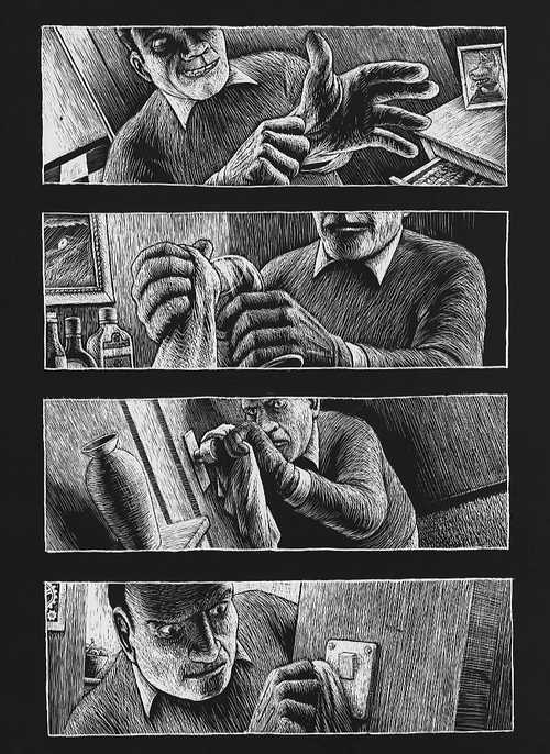 Planche de l'album de Thomas OTT, Tales of error, 1996, dessin sur carte à gratter, édition Moderne, Zürich, Suisse.