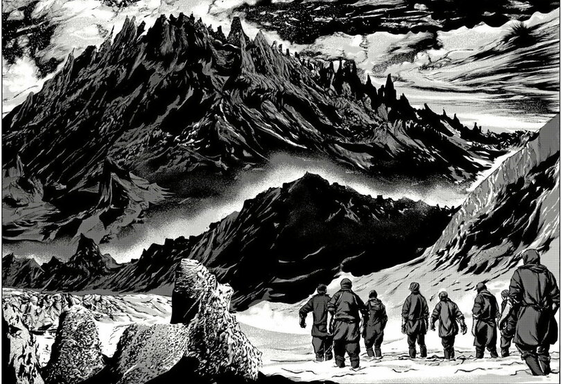 Planche de l'album Les Montagnes Hallucinées, Howard Philips LOVECRAFT (scénario), Gō TANABE (dessin), 2019, encre de Chine, éditions Ki-oon